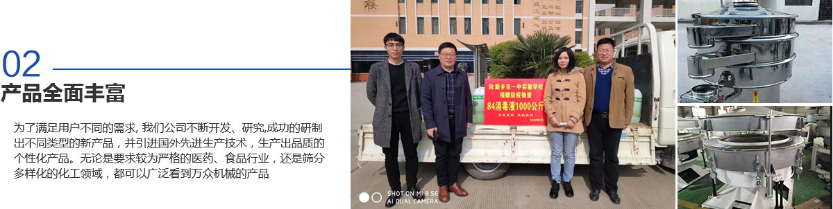 新鄉(xiāng)市萬(wàn)眾機(jī)械設(shè)備有限公司是生產(chǎn)振動(dòng)機(jī)械、篩分設(shè)備和過(guò)濾設(shè)備的專(zhuān)業(yè)廠(chǎng)家之一,擁有生產(chǎn)設(shè)備、雄厚的技術(shù)力量、完善的檢測(cè)手段、嚴(yán)格的管理體系。是河南省的商標(biāo)之一,被河南省科學(xué)技術(shù)廳頒定為高新技術(shù)企業(yè),為新鄉(xiāng)市“守合同重信用企業(yè)“。質(zhì)量信得過(guò)產(chǎn)品、質(zhì)量服務(wù)消費(fèi)者滿(mǎn)意企業(yè)、合格產(chǎn)品等榮譽(yù)稱(chēng)號(hào)。擁有自主進(jìn)出口經(jīng)營(yíng)權(quán),產(chǎn)品遍布各地,并遠(yuǎn)銷(xiāo)北美、西歐及東南亞等地區(qū)。
