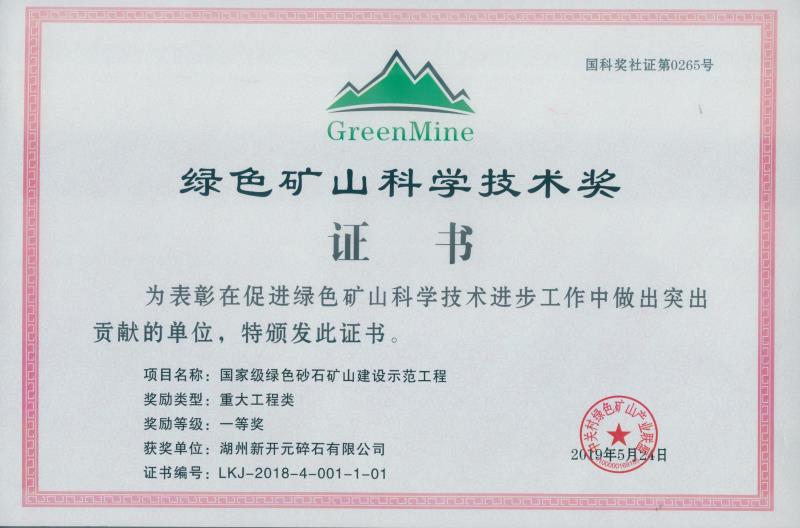 公司獲得“2018綠色礦山科學技術獎”重大工程類一等獎殊榮。綠色礦山科學技術獎是由科技部國家獎勵辦批準并且在其監(jiān)督下開展工作的社會力量獎,已納入科技部社會獎勵目錄。
