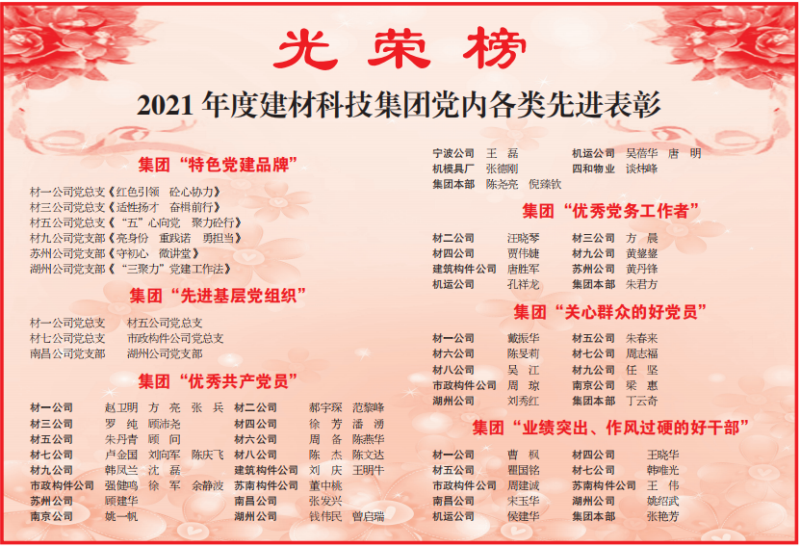 7月4日,上海建工建材科技集團召開黨內(nèi)先進表彰會暨黨建品牌發(fā)布會。湖州公司榮獲2021年度上海建工建材科技集團“先進基層黨組織”,姚紹武同志榮獲上海建工建材科技集團“業(yè)績突出、作風(fēng)過硬的好干部”,錢偉民同志、曾啟瑞同志榮獲上海建工建材科技集團“優(yōu)秀共產(chǎn)黨員”,劉秀紅同志榮獲上海建工建材科技集團“關(guān)心群眾的好黨員”。